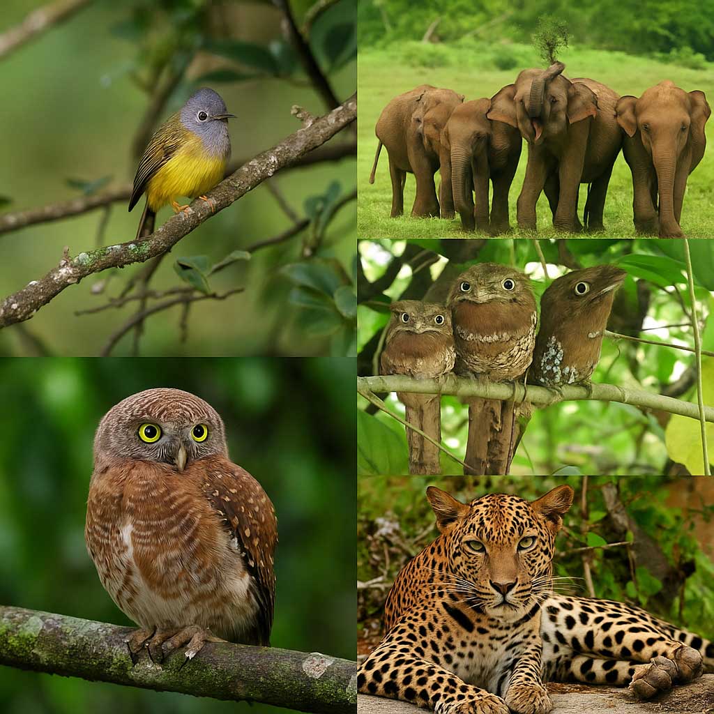 • Mammals: Sri Lankan Leopard, Sloth Bear, Elephant, Spotted Deer, Wild Boar, Langurs.